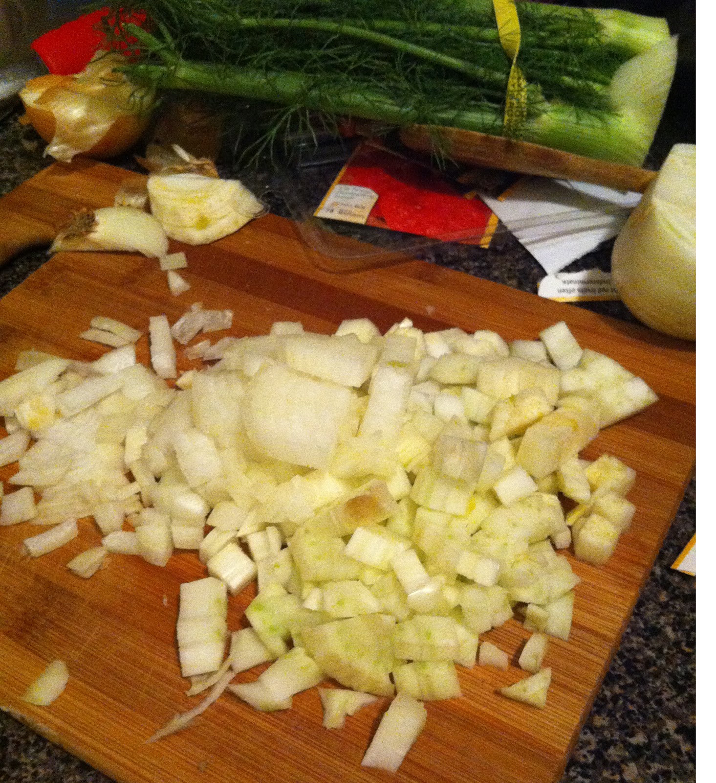 Preheat oven to 375. Saute the chopped onions and fennel with the butter until the onions are translucent, about 10-15 minutes.